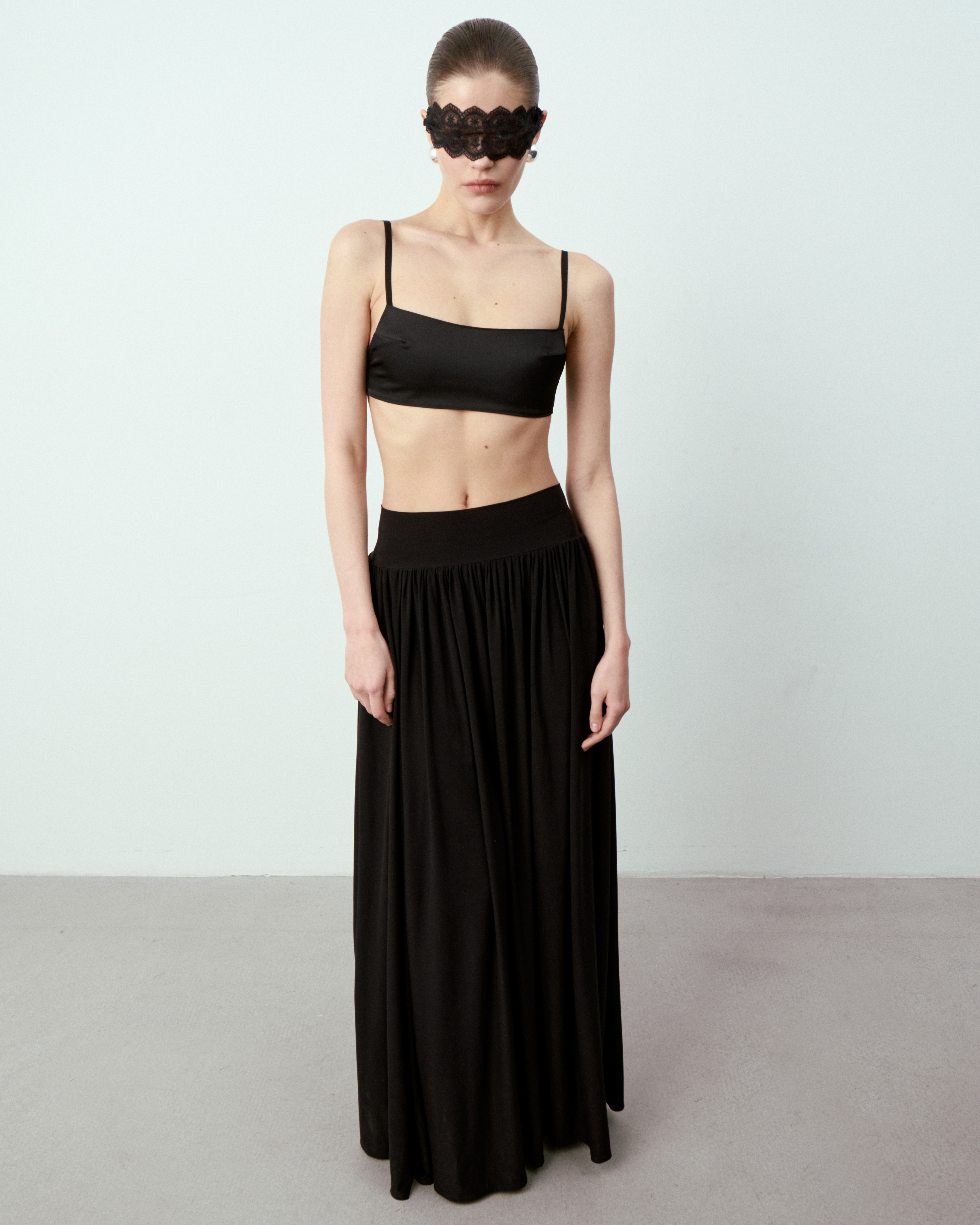 Топ из чёрного атласа с тонкими бретелями и минималистичной линией декольте. Сдержанный крой подчёркивает фигуру, сохраняя баланс между лаконичностью и чувственностью. Матовая глубина чёрного цвета в сочетании с лёгким атласным блеском создаёт утончённый и уверенный образ.