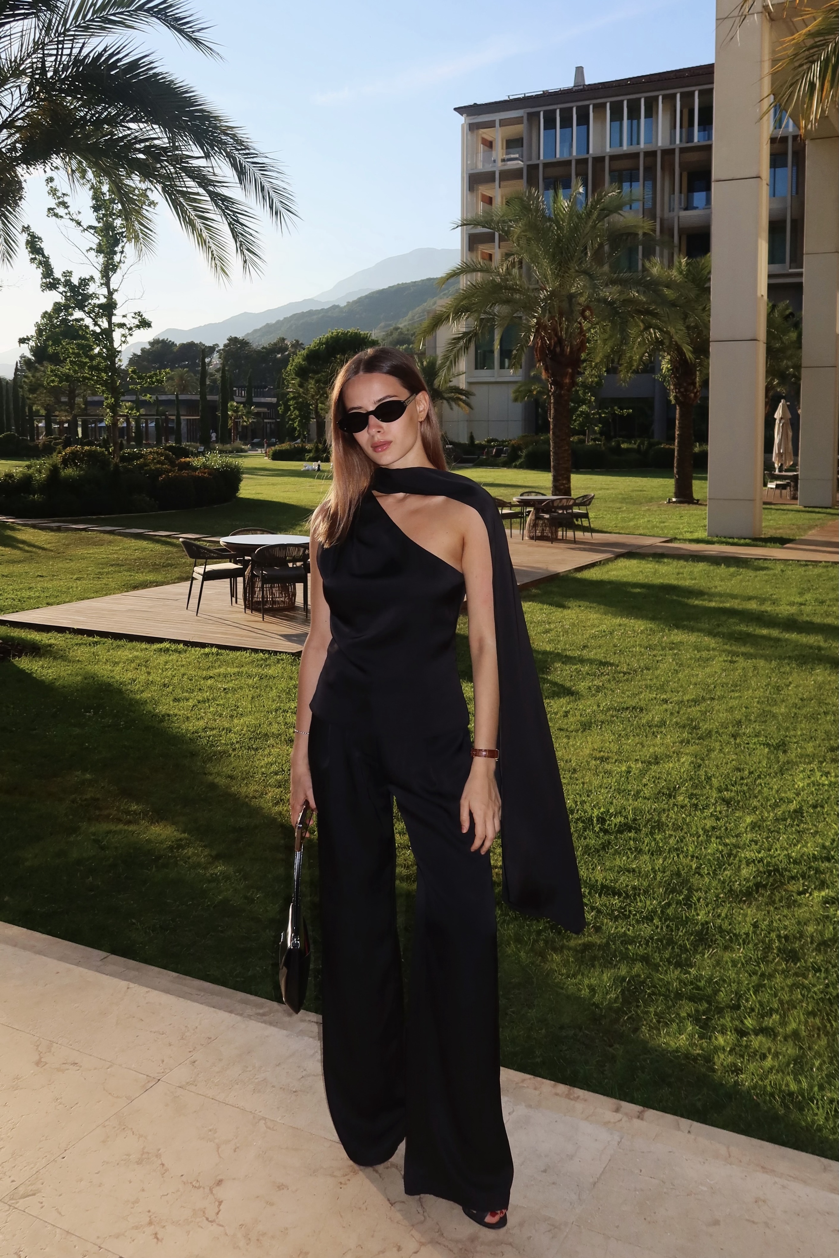 Топ на одно плечо, выполненный из перламутровой шелковой ткани, элегантно драпируется через плечо, создавая изящный и грациозный образ. Нежный шарф приседает изделию дополнительную утонченность и делает его идеальным выбором для тех, кто ищет сочетание элегантности и стиля.
